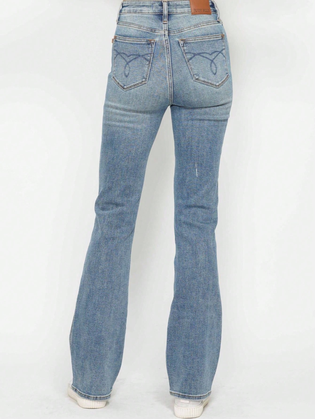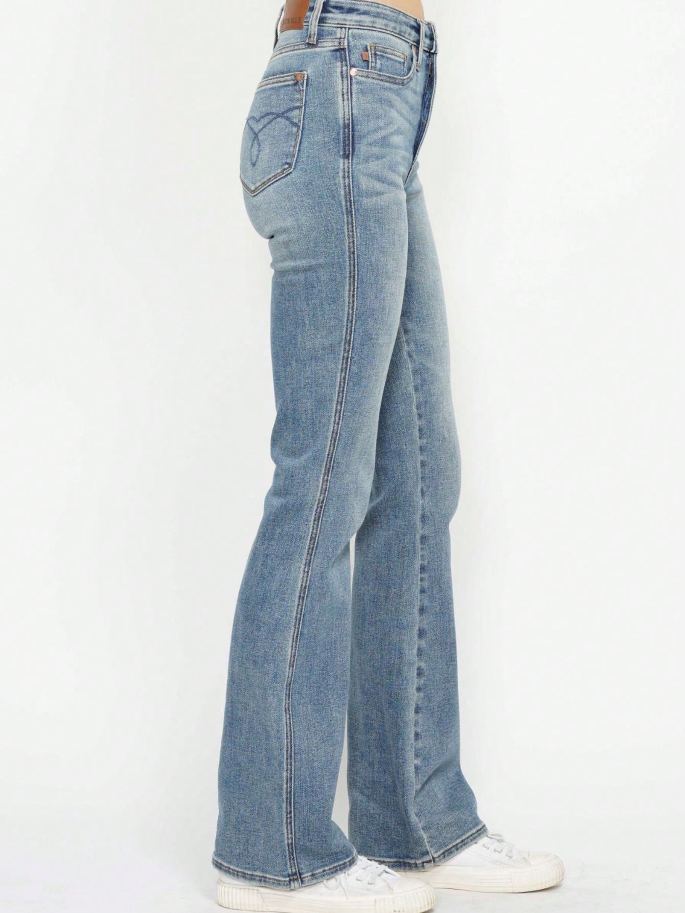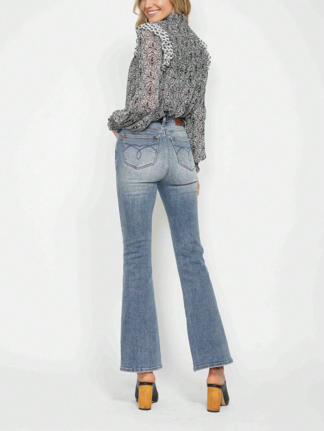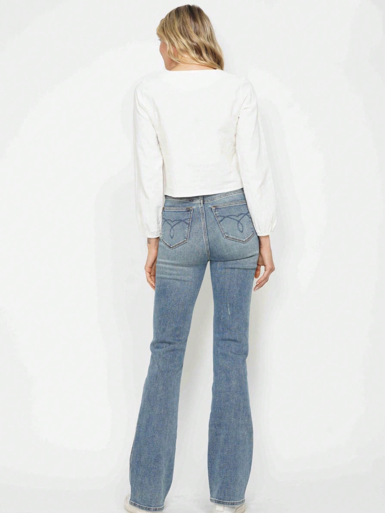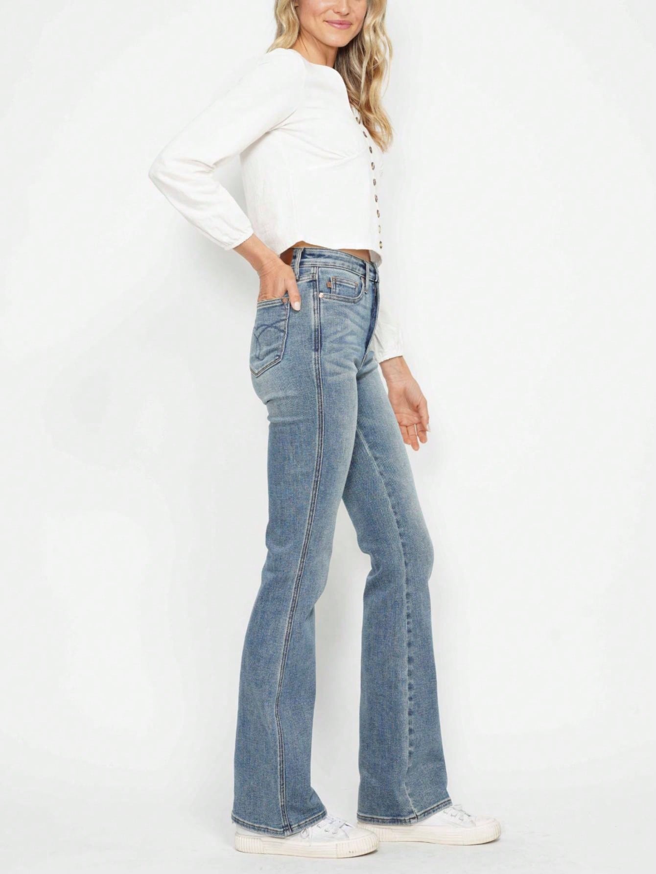 Tummy Control Back Embroidered Pocketed Bootcut Jeans are a stylish and figure-flattering option for your denim collection. The tummy control feature helps smooth and shape your midsection for a streamlined look. The embroidered pockets add a fun and fashion detail to the back of the jeans. The bootcut silhouette is classic and versatile. making these jeans a great option for a variety of occasions. Pair them with a blouse and heels for a dressier look. or with a casual tee and sneakers for a more relaxed outfit. These jeans offer both style and functionality. making them a must-have in your closet.