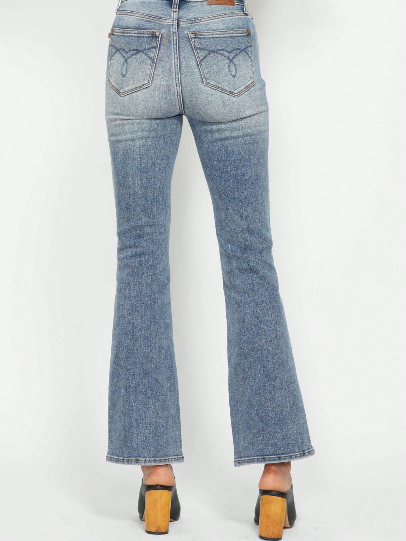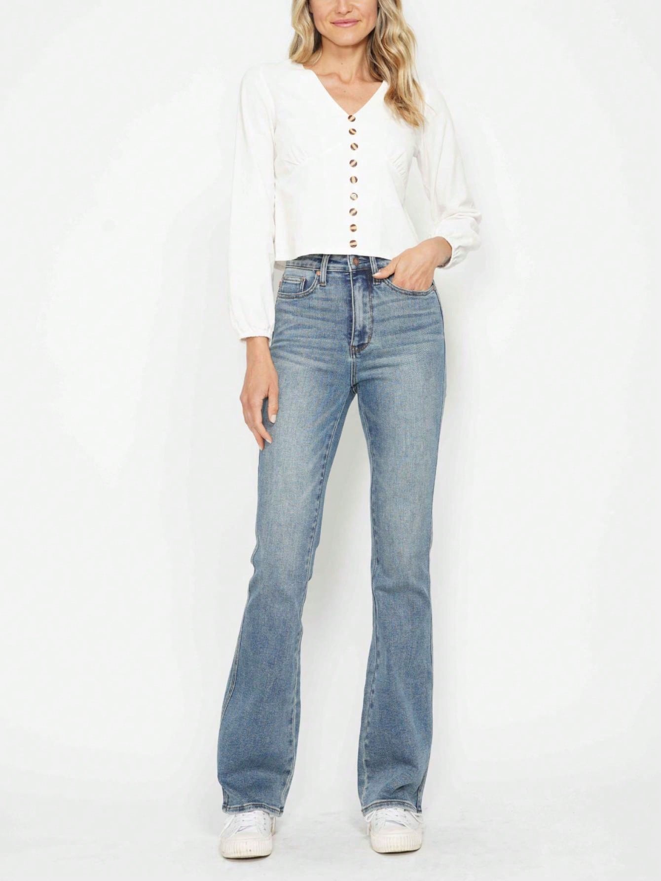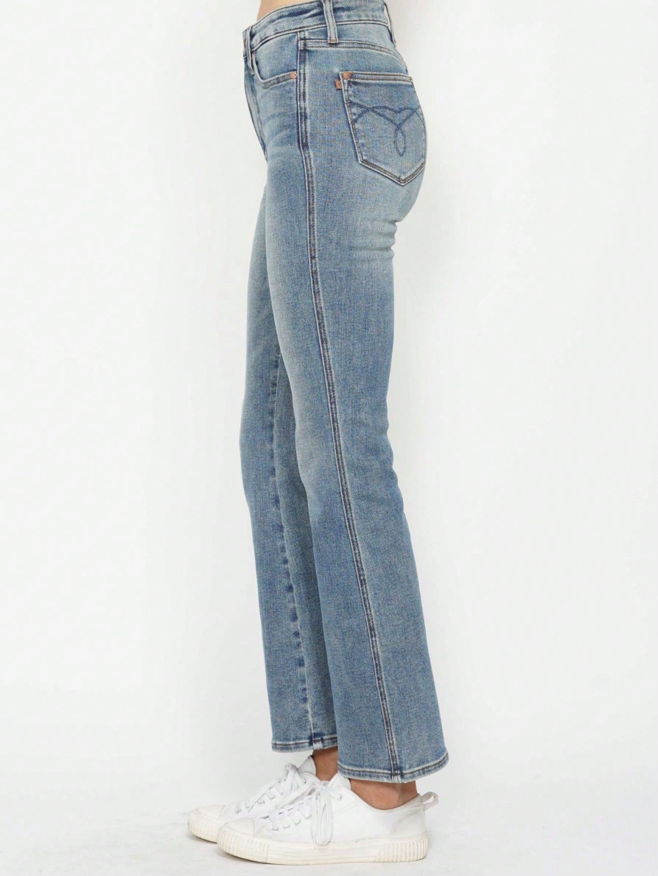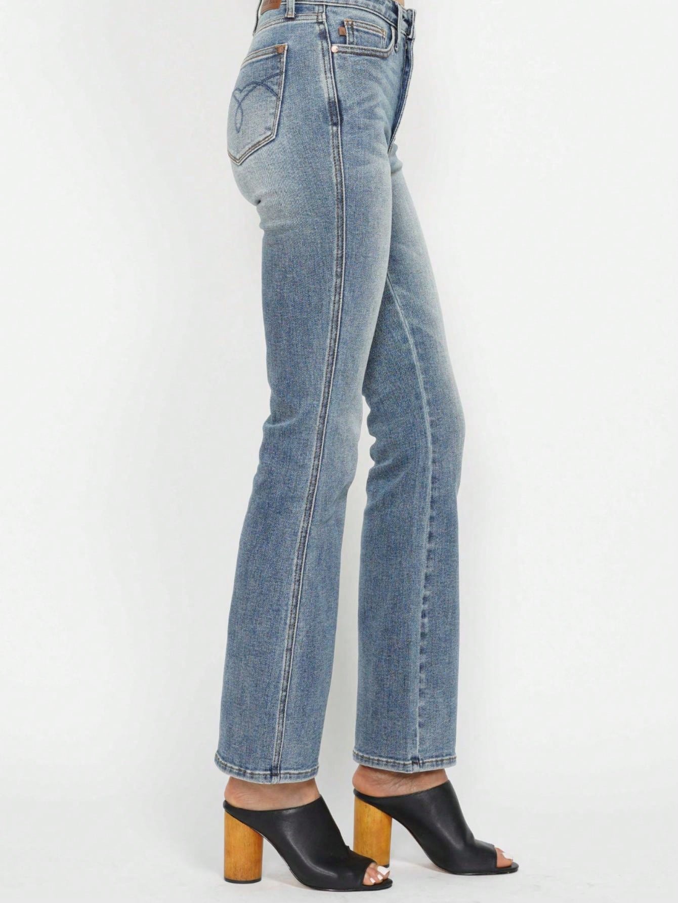 Tummy Control Back Embroidered Pocketed Bootcut Jeans are a stylish and figure-flattering option for your denim collection. The tummy control feature helps smooth and shape your midsection for a streamlined look. The embroidered pockets add a fun and fashion detail to the back of the jeans. The bootcut silhouette is classic and versatile. making these jeans a great option for a variety of occasions. Pair them with a blouse and heels for a dressier look. or with a casual tee and sneakers for a more relaxed outfit. These jeans offer both style and functionality. making them a must-have in your closet.
