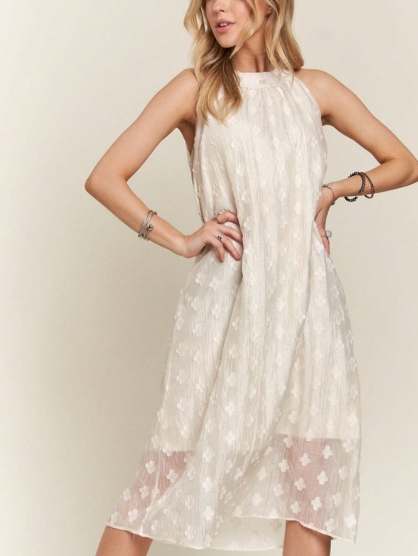 Womens Casual Floral Romantic Chic Halter Neck Embroidered Flower Pattern Swing Midi Dress Ivory White Sleeveless Full Length Mock Neck Shimmery Fabric Perfect for Summer Wedding Guest Party Occasions